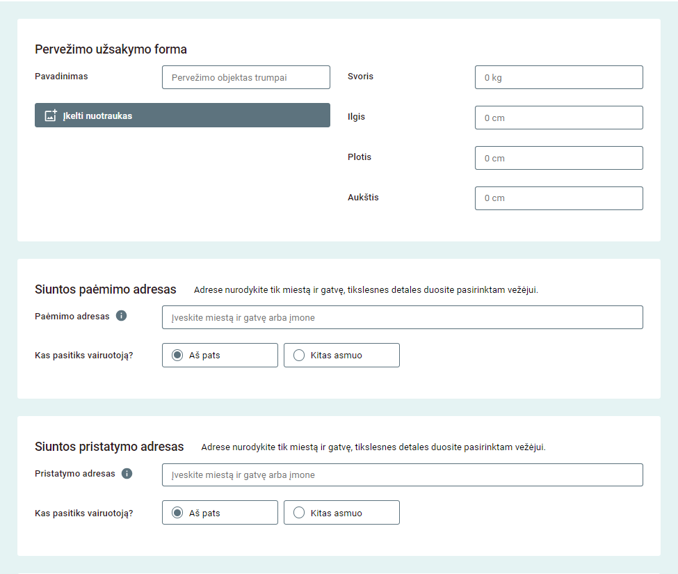 Kurjerių tarnybos gali suteikti jums paslaugą ir nuvežti jūsų siuntinį gavėjui, tačiau didelė siunta viršija nustatytus maksimalius dydžius, todėl siuntimas labai brangiai kainuoja. Mūsų Bendruomenėje jūs galėsite išsirinkti geriausia kainą ir gauti aukščiausios kokybės paslaugą. Užsisakyti yra visai paprasta. Užpildę užklausą, kurioje nurodysite kokį siuntinį norite išsiųsti, užpildę reikiamus laukus, gausite užklausos reikalavimus atitinkančius pasiūlymus, iš kurių galėsite rinktis jūsų poreikius ir lūkesčius atitinkančius pasiūlymus už geriausią kainą. Tam kad gautumėte tiksliausią kainos pasiūlymą iš karto, reikėtų labai tiksliai aprašyti kokią nestandartinę siuntą norite išsiųsti. Kiek įmanoma tiksliau ją aprašykite: nurodykite dydį, išmatavimus, svorį, laikymo sąlygas. Būtų puiku, jei galėtumėte įkelti keletą siuntinio nuotraukų. Taip vairuotojai galės įsivertinti savo galimybes ir pateikti tikslų kainos siūlymą.